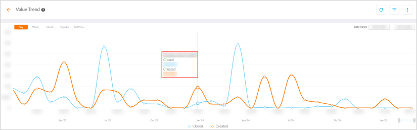 Hovering over the series displays a tooltip of the date on X-axis and the respective deductions Closed and Created values (amounts).