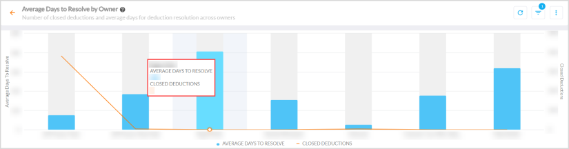 Hovering over the series displays a tooltip of the owner name and the AVERAGE DAYS TO RESOLVE and CLOSED DEDUCTIONS values.