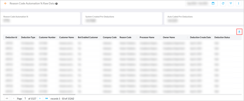 The Reason Code Automation % Raw Data dashboard provides the entire raw data used for the calculation of Reason Code Automation % Key Performance Indicator (KPI) .