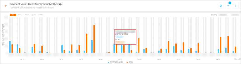 Hovering over the series displays a tooltip of the date on X-axis and the respective transaction amounts of credit card and ACH payments.
