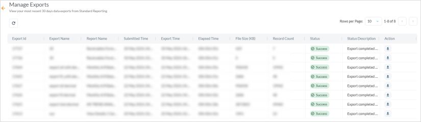 You can also navigate to Analytics > click the respective module of the dashboard or report category such as Value Realization or Standard Reports > click the Manage Exports icon to view your exports queue.