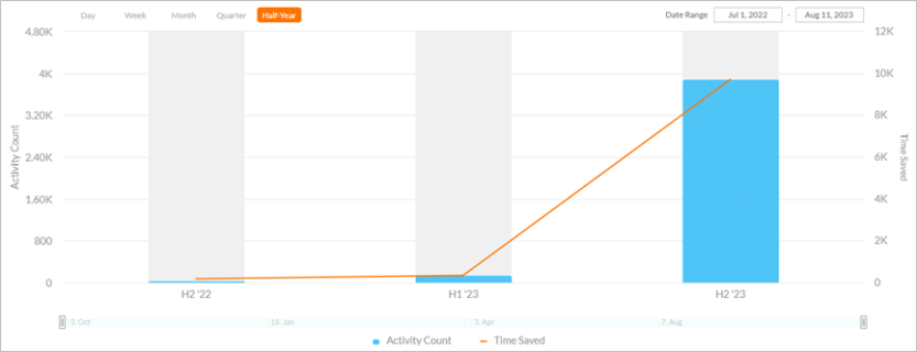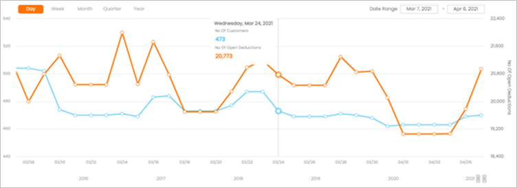 You can view the data for a Day, Week, Month, Quarter, or Year, by selecting an option in the Show data by field. You can also manually enter a time period in the Date Range field. The data in the report is displayed based on the values provided in these fields.
